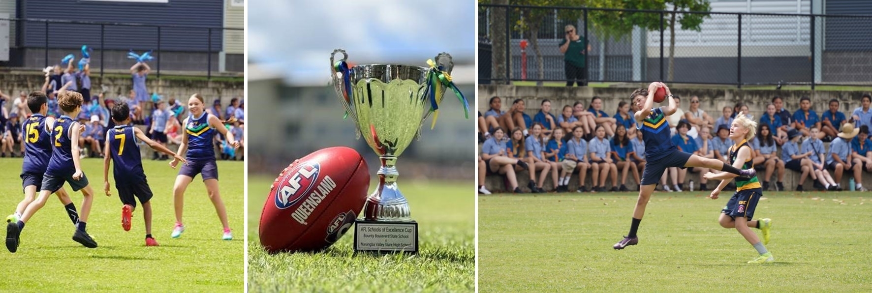 In partnership with AFL Queensland, the Bounty Boulevard State School AFLQ School of Excellence is an exciting program aimed at developing students physically and socially through Australian Rules Football. Available for students in Grades 3 to 6, students will have the opportunity to develop high level Australian Rules skill and game development, including participation in the AFLQ Schools Cup. Program partner Narangba Valley SHS AFLQ School of Excellence, highlighted by the annual BBSS V NVSHS AFLQ Schools of Excellence Cup, allows an authentic and sustainable Prep to 12 pathway of school AFL for our students. Known as the Gurooman, Gubbi Gubbi for Kangaroo, our AFL teams and students strive to always move forward, as one mob, achieving success together. For applications, please contact Deputy Principal Greg McMahon, via email gmcma14@eq.edu.au
